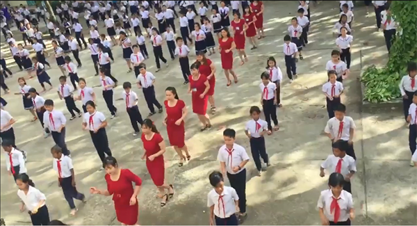 Bên cạnh, một hàng giáo viên mặc váy đỏ cũng nhảy cùng các em học sinh vô cùng duyên dáng và không kém phần đáng yêu.