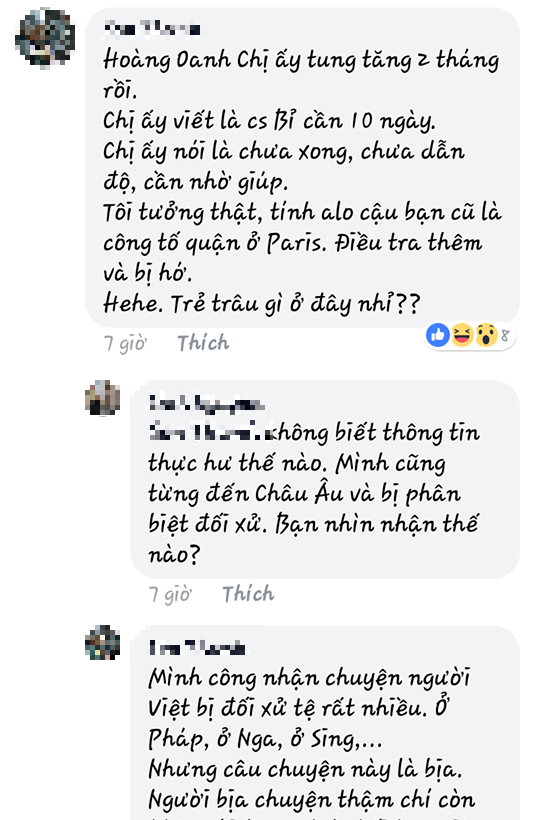 "Sao ko thấy bạn liên hệ Đại sứ quán Việt Nam ở Paris? Cảnh sát khi bắt bạn thì họ cũng phải thông báo với ĐSQ Việt Nam chứ nhỉ? Hơn nữa, họ phải có thông dịch người Việt chứ. Mình từng có trải nghiệm một đêm như bạn vì nhầm lẫn ở Pháp cách đây tầm 14 năm nên biết. Dù mình nói tiếng Pháp được nhưng họ vẫn thuê thông dịch người Việt" - FB Quoc Vu Huynh thắc mắc.
