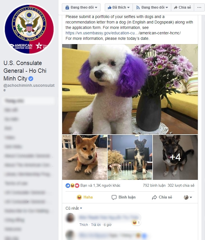Sáng 1/4, trang chính thức có tick xanh của Tổng lãnh sự quán Mỹ tại TP.HCM cho biết đang tìm nhân sự cho vị trí C.A.T (Canine Awareness Technician) tức "Khuyển viên" cho gia đình khuyển.