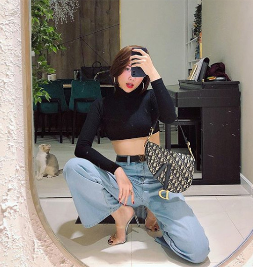 Không hẹn mà gặp, Tóc Tiên cũng đụng độ mốt croptop cổ lọ đen phối quần jeans. Xu hướng ăn mặc này mang đậm cảm hứng thời trang những năm đầu 2000, mang đến vẻ trẻ trung, sexy cho các cô gái.