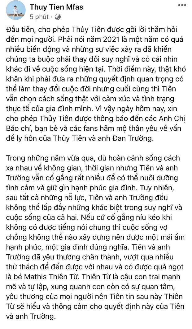 "Đầu tiên, cho phép Thủy Tiên được gửi lời thăm hỏi đến mọi người. Phải nói năm 2021 là một năm có quá nhiều biến động và những sự việc xảy ra đã khiến chúng ta buộc phải thay đổi suy nghĩ và có cái nhìn khác đi về cuộc sống hiện tại. Thời điểm này, thật khó khăn khi phải đưa ra những quyết định quan trọng có thể làm thay đổi cuộc đời nhưng cuối cùng thì Tiên vẫn chọn cách sống thật với cảm xúc và tình trạng thực tế của gia đình mình. Vì vậy ngày hôm nay, xin cho phép Thủy Tiên được thông báo đến các anh chị cáo chí, bạn bè và các fan hâm mộ thân yêu về vấn đề ly hôn của Thủy Tiên và anh Đan Trường", vợ cũ Đan Trường bày tỏ.
