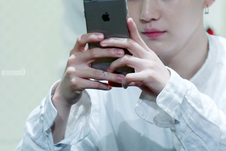 Nhưng Suga (BTS) không cần tốn nhiều công sức thế. Suga chỉ cần nhón ngón cái cùng ngón giữa là đủ để ôm trọn điện thoại rồi.