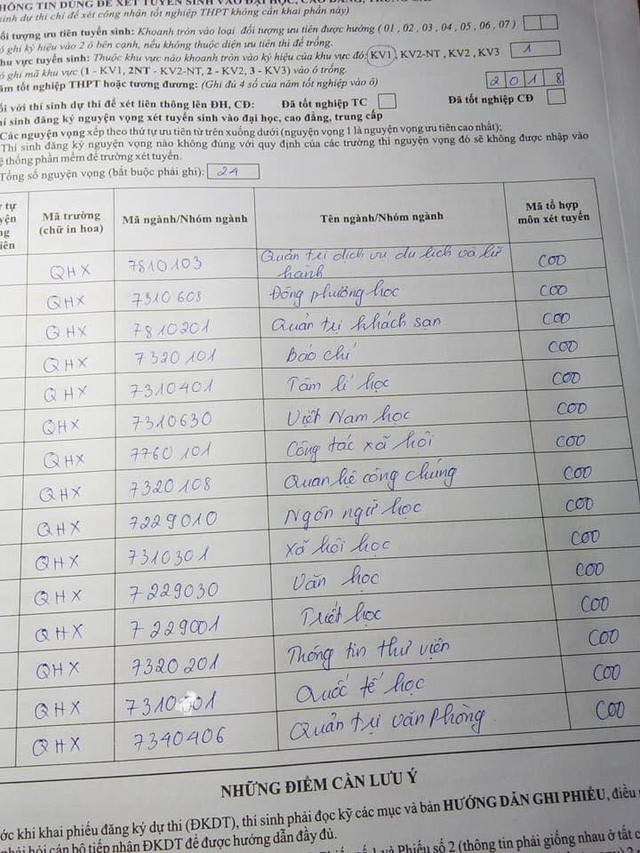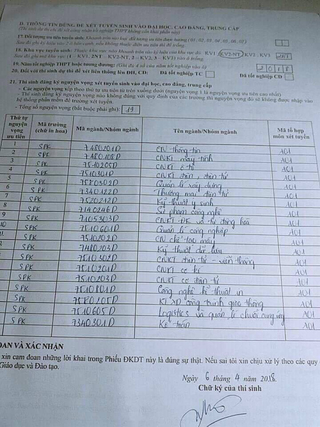 Một phiếu đăng ký của thí sinh cả 19 nguyện vọng vào 19 ngành của cùng một trường duy nhất. (Ảnh lan truyền trên mạng xã hội)