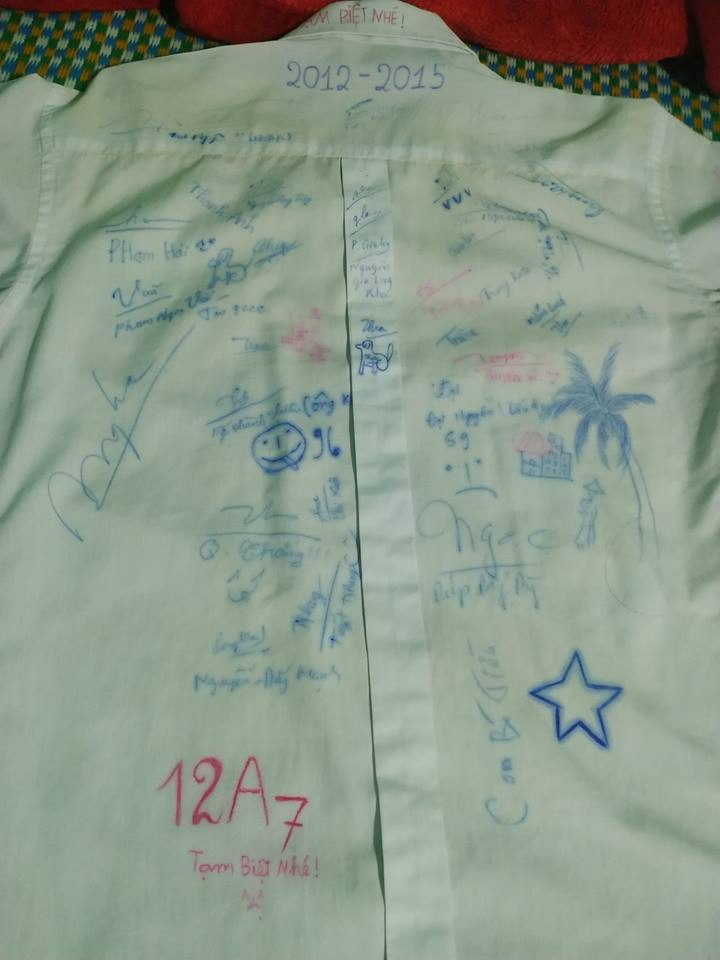 "Hôm nay tình cờ thấy lại cái áo này các bạn ạ. Đây là áo trắng cuối cùng của thời cấp 3, trên áo có gần hết chữ ký của thành viên trong lớp năm 12. Mà năm 12 cuối cấp đáng lẽ phải vui nhưng mà lớp tớ lại là buồn các cậu ạ. Chỉ trong một năm lớp tớ đã có 2 đứa phải ra đi mãi mãi ở tuổi thanh xuân khi bị tai nạn, 2 đứa bị tai nạn cách nhau mấy tháng.