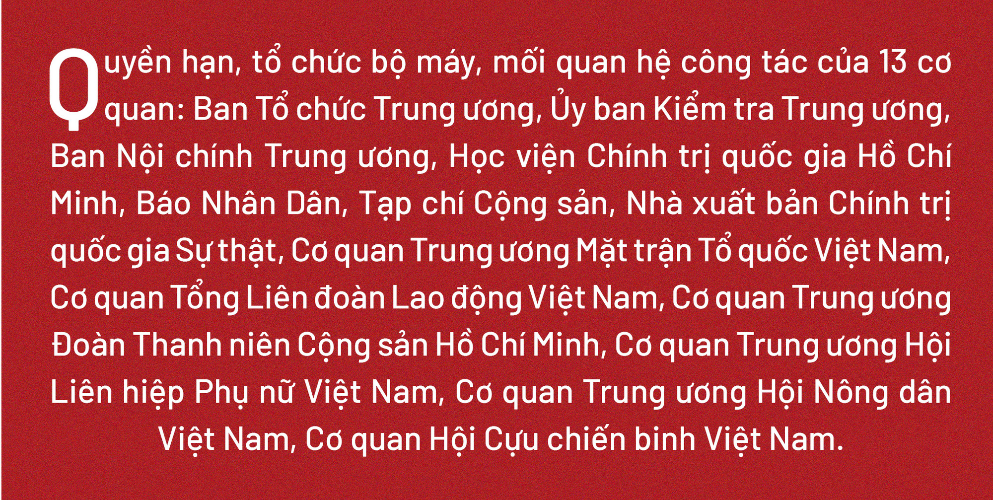 Với tinh thần tiên phong, gương mẫu, sau một thời gian gấp rút chuẩn bị, vào cuối tháng 12/2024, Bộ Chính trị, Ban Bí thư đã công bố Quyết định về chức năng, nhiệm vụ, quyền hạn, tổ chức bộ máy, mối quan hệ công tác của 13 cơ quan ban Đảng, đơn vị sự nghiệp của Đảng, Ủy ban Trung ương Mặt trận Tổ quốc Việt Nam và các đoàn thể chính trị - xã hội ở Trung ương.