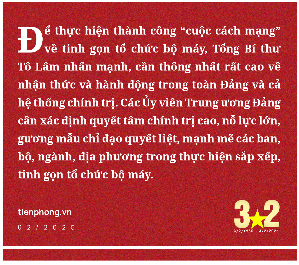 Phát biểu bế mạc Hội nghị Ban Chấp hành Trung ương khóa XIII vào ngày 25/11/2024, Tổng Bí thư Tô Lâm một lần nữa nhấn mạnh, các Ủy viên Trung ương Đảng cần xác định quyết tâm chính trị cao, nỗ lực lớn, gương mẫu chỉ đạo quyết liệt, mạnh mẽ trong thực hiện sắp xếp, tinh gọn bộ máy. Đây là nhiệm vụ đặc biệt quan trọng nên cần thống nhất rất cao về nhận thức và hành động trong toàn Đảng và cả hệ thống chính trị.