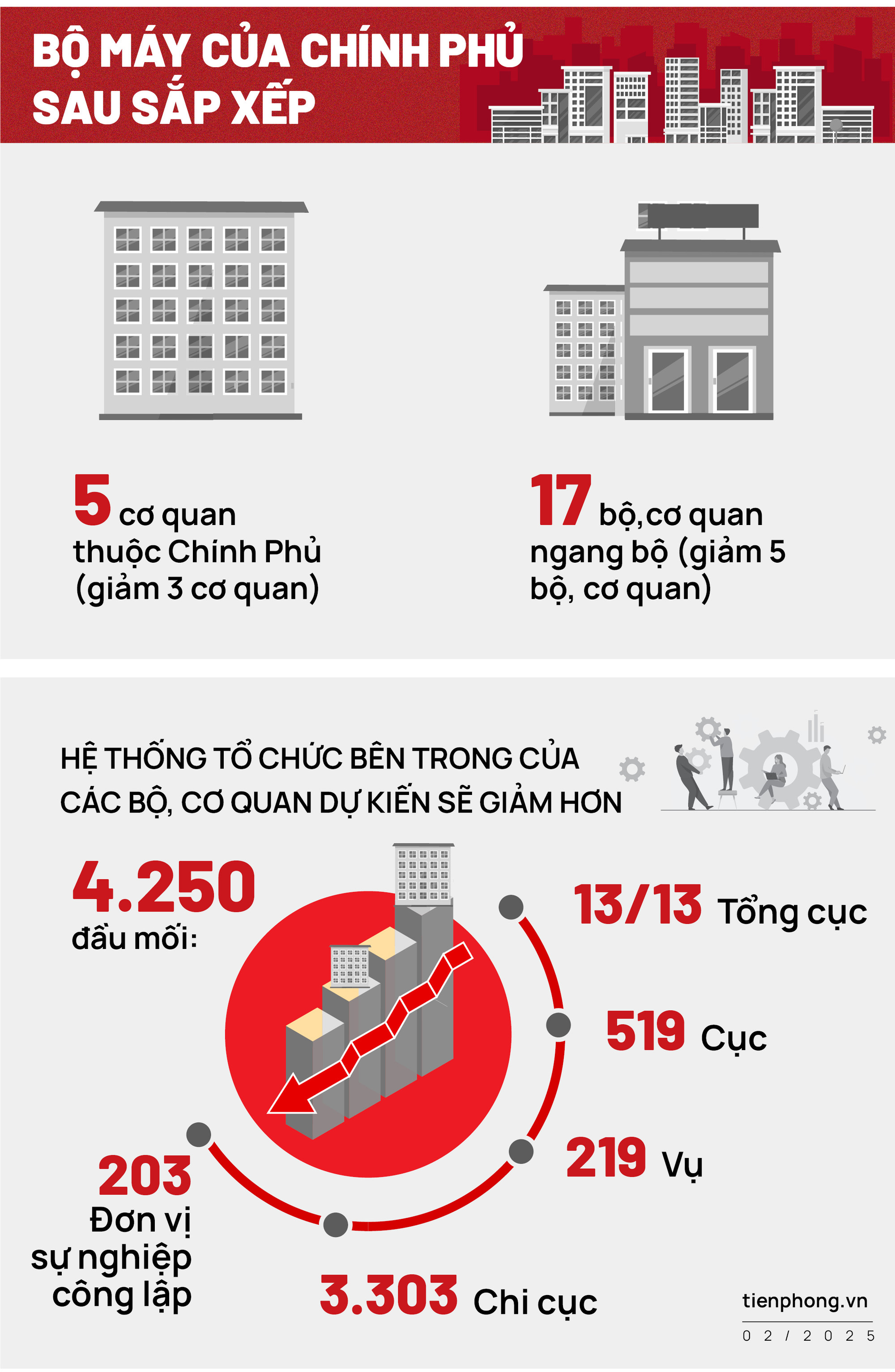 Theo các phương án được hoàn thiện để trình Bộ Chính trị, Ban Chỉ đạo Trung ương, Bộ máy của Chính phủ sau khi sắp xếp dự kiến có 22 bộ, cơ quan gồm: 17 bộ, cơ quan ngang bộ (giảm 5 bộ, cơ quan) và 5 cơ quan thuộc Chính phủ (giảm 3 cơ quan). Cùng với đó, hệ thống tổ chức bên trong các bộ, cơ quan dự kiến sẽ giảm hơn 4.250 đầu mối. Trong đó, dự kiến sẽ giảm 13/13 tổng cục, 519 cục, 219 vụ, 3.303 chi cục, 203 đơn vị sự nghiệp công lập.