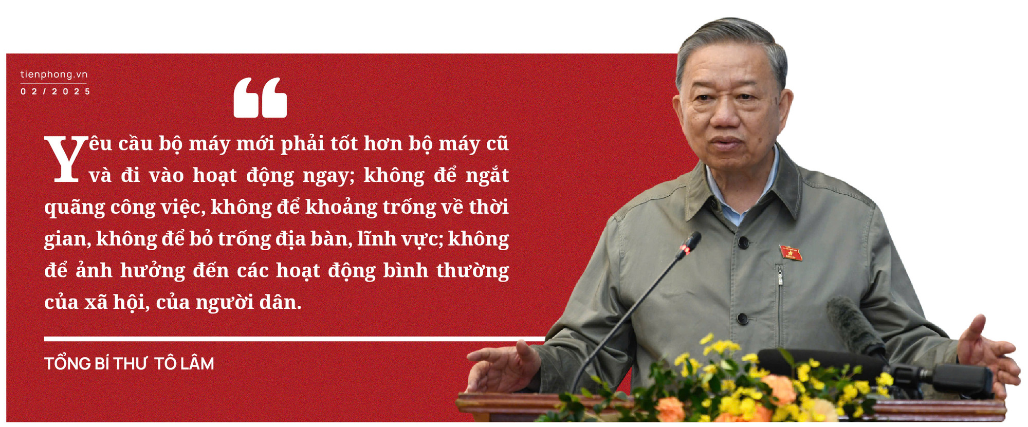 Đề cập đến vấn đề này tại Kỳ họp thứ 8 của Quốc hội, Tổng Bí thư Tô Lâm khẳng định “không tinh gọn bộ máy thì không phát triển được”. Tổng Bí thư dẫn chứng, ngân sách hiện đang chi tới gần 70% để trả lương, chi thường xuyên, phục vụ cho hoạt động, chỉ còn lại 30%, làm gì còn nguồn lực cho đầu tư phát triển? Thực trạng trên đặt ra yêu cầu cấp bách tinh gọn bộ máy, giảm biên chế, giảm chi tiêu thường xuyên. Trung ương mà gọn, tỉnh sẽ gọn, trên không có bộ thì tỉnh sẽ không có sở và cấp huyện không có phòng. Để làm được điều này, Tổng Bí thư lưu ý, Trung ương phải gương mẫu, các ban của Đảng phải gương mẫu và Quốc hội, Chính phủ gương mẫu.