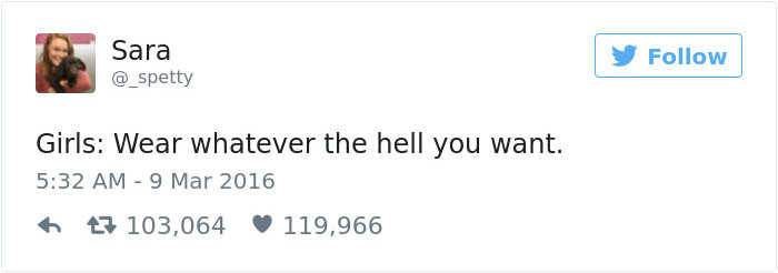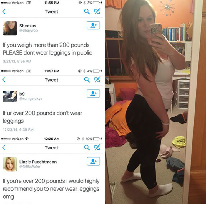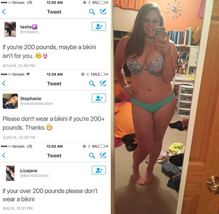 Nhưng mới đây, Sara Pretty - một cô nàng nặng hơn 200 pound (tương đương với gần 100 kg) đã đăng một series hình với chủ đề #Outfit_of_the_day lên twitter để chứng minh rằng: Team-thừa-mỡ-một-xíu hoàn toàn có thể mặc những bộ legging khỏe khoắn, bikini quyến rũ hay croptop năng động. Và để "đón đầu" những bình luận ác ý về ngoại hình của mình, cô nàng đã tweet: "Girls: Wear whatever the hell you want!" (Tạm dịch: Gửi các cô gái, hãy mặc tất cả những gì bạn thấy ổn!) như một tuyên ngôn nữ quyền.