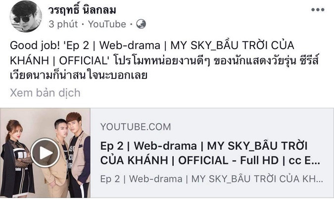 Sau khi tập đầu tiên của series phim ngắn My Sky - Bầu trời của Khánh chính thức lên sóng, Duy Khánh đã nhận được rất nhiều lời khen của khán giả. Không chỉ khán giả trong nước mà ở Trung Quốc cũng ủng hộ nhiệt tình cho sự án này. Ngay lập tức, Duy Khánh đã tung ngay tập 2 cách đây ít giờ.