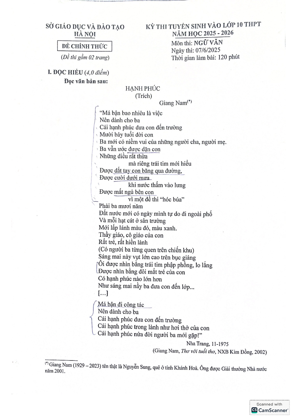 Đề môn Ngữ Văn kì thi vào lớp 10 của Sở GD & ĐT Hà Nội năm 2025 với thời gian làm bài 120 phút như sau: