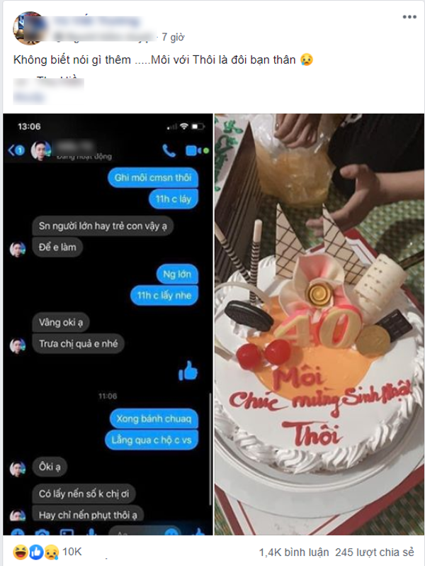 Đến khi nhận bánh là thành phẩm của việc "nhầm nhọt sang trồng trọt", chị H. chỉ biết "đứng hình" vì dòng chữ hài hước trên bánh "Môi chúc mừng sinh nhật Thôi".