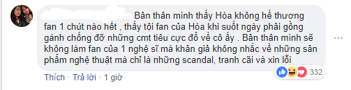 Sau động thái này của Hòa Minzy, làn sóng giận dữ của khán giả không những không dừng lại mà còn tiếp tục tăng lên khi nhiều người cho rằng cô đang xin lỗi quá nhiều, thậm chí là trách cứ fan vô lí vì đã không bên mình lúc khó khăn.
