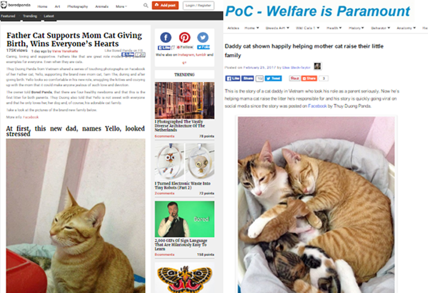 Sau những ngày làm mưa làm gió mạng xã hội Việt, “mèo bố của năm” tiếp tục đốn tim cộng đồng quốc tế trước những cử chỉ quan tâm, âu yếm dành cho mèo vợ trong suốt quá trình vượt cạn. Hàng loạt các trang web nổi tiếng nước ngoài chuyên viết về động vật (như Boredpanda, PoC, The Dodo…) đã đưa tin về gia đình mèo Việt vô cùng đáng yêu này.