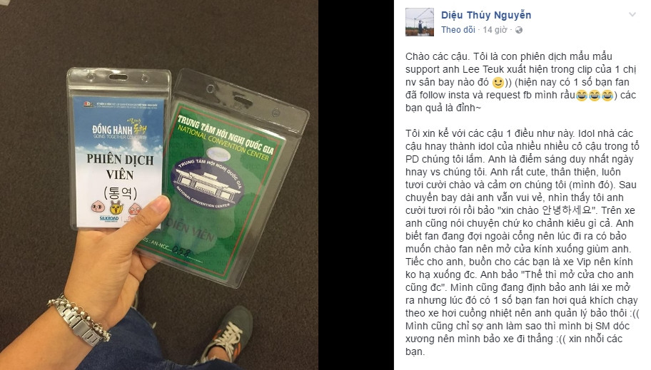 Không những thế, trên trang Facebook cá nhân của một bạn phiên dịch viên cho Lee Teuk còn chia sẻ: “Anh rất rất thân thiện. Mình confirm (xác nhận) lại nữa. Anh chào gần như tất cả mọi người anh gặp. Từ vệ sĩ, staff, phiên dịch đến nghệ sĩ việt, dancer Việt...” Facebooker trên còn kể thêm một câu chuyện rất đáng yêu từ anh chàng rằng Lee Teuk đã hỏi “Sao các bạn Việt Nam còn thích anh nhiều thế?”. Chả là đã 5 năm kể từ lần gần đây nhất Lee Teuk sang Việt Nam. Bạn phiên dịch trả lời "Anh vẫn rất rất nổi tiếng mà và trước kia hay bây giờ vẫn vậy", anh đã cười rất sung sướng. Lee Teuk còn định kéo cửa kính xe ô tô xuống để chào fan, tiếc rằng quản lý lo cho an toàn của Lee Teuk nên không cho phép.