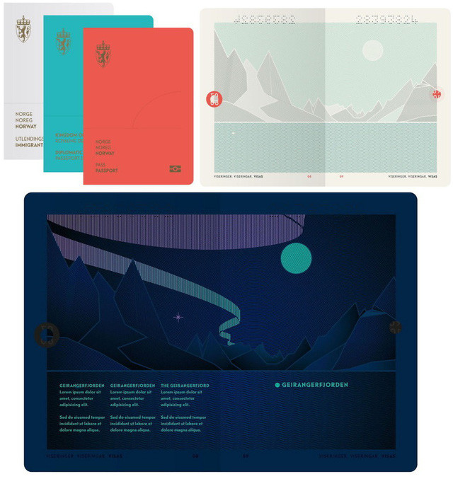 Nếu nhìn cuốn hộ chiếu của Na Uy dưới ánh sáng cực tím, du khách sẽ bất ngờ trước bước tranh về Bắc Cực quang chiếu trên bầu trời, dưới là các dãy núi. Hình ảnh này do nhóm thiết kế Neue sáng tạo, lấy ý tưởng từ đặc trưng nhất của Na Uy. Bìa hộ chiếu gồm 3 màu trắng, đỏ và xanh da trời, đặc trưng cho nhóm người nhập cư, công dân Na Uy và các nhân viên ngoại giao.