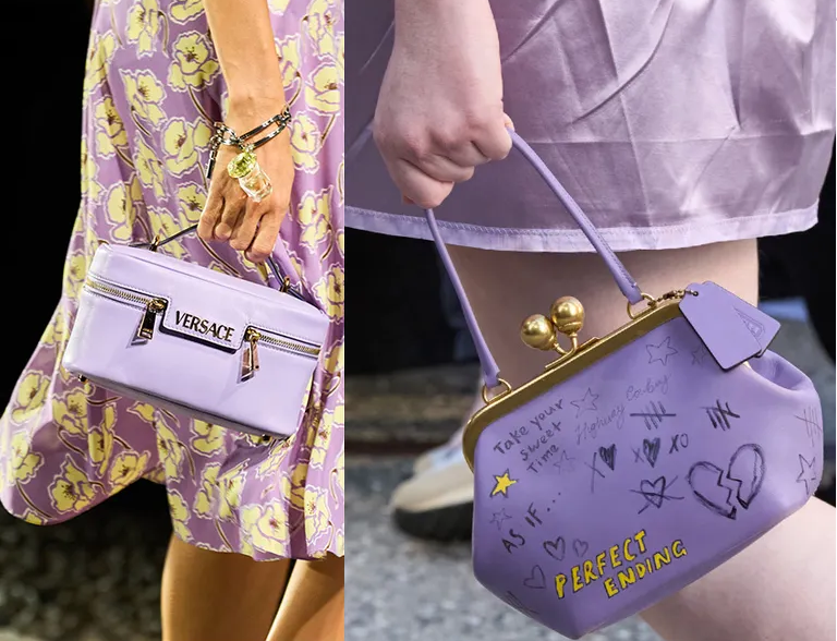 Ví dụ, một chiếc túi xách màu tím nhẹ nhàng, cổ điển được vẽ nguệch ngoạc như viết tay, mang đến một vẻ ngoài ấn tượng và riêng biệt trong bộ sưu tập của Coach. Trong khi đó, tại Versace xuất hiện một chiếc hộp đựng đồ trang điểm màu tím lilac trang trí tên thương hiệu nổi bật bằng chữ vàng.