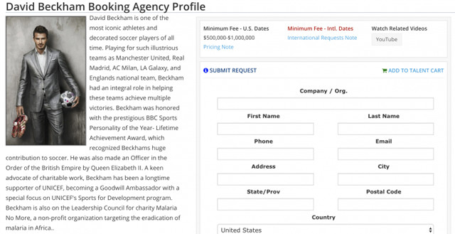Theo thông tin trên celebritytalent.net, website chuyên đặt lịch với các siêu sao nổi tiếng hàng đầu thế giới, mức giá để mời David Beckham xuất hiện trong một sự kiện thông thường vào khoảng từ 500.000 USD đến 1 triệu USD.