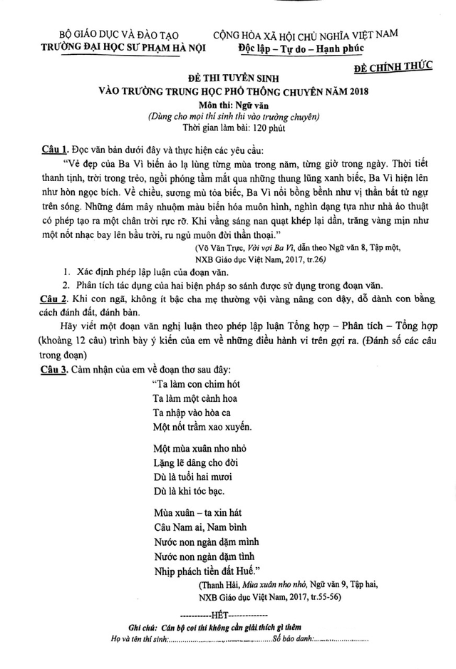 Đề thi Ngữ văn lớp 10 chuyên ĐH Sư phạm Hà Nội năm 2018.