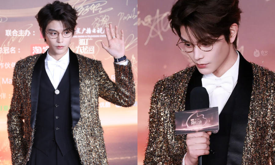 Đinh Vũ Hề nổi bật trong set đồ đến từ thương hiệu xa xỉ Celine. Chiếc vest "kim sa hột lựu" góp phần nâng tầm bộ suit đơn giản, mang lại diện mạo bảnh bao cho chàng "Tử Kỳ". Các fan cũng nhận ra kể từ sau Vĩnh Dạ Tinh Hà, anh thường xuyên đeo kính đi dự sự kiện.