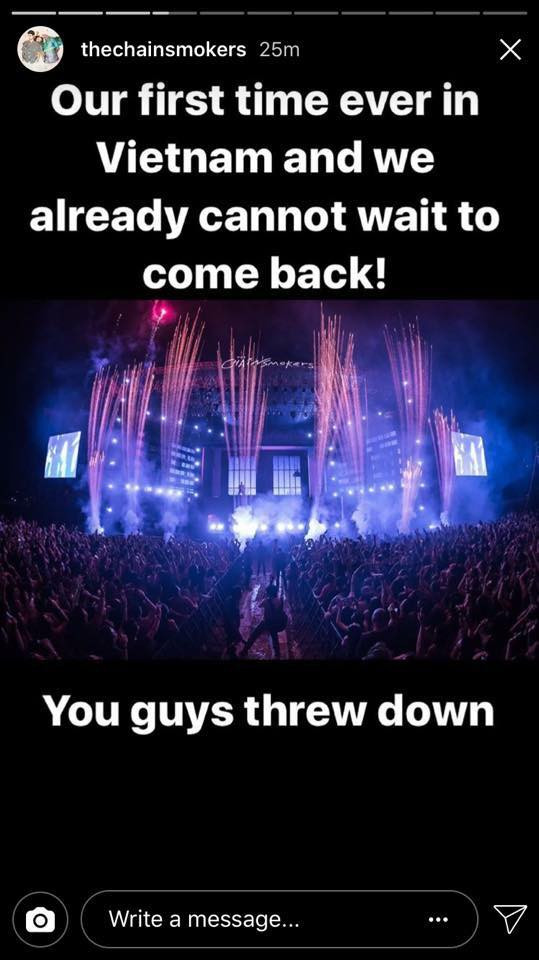 Sau khi chương trình kết thúc, nhóm The Chainsmokers đã đăng trên Story (Instagram) chính thức của mình hình ảnh đêm nhạc tại TP.HCM, cảm ơn các fan Việt Nam đã cháy hết mình và mong sớm được trở lại.