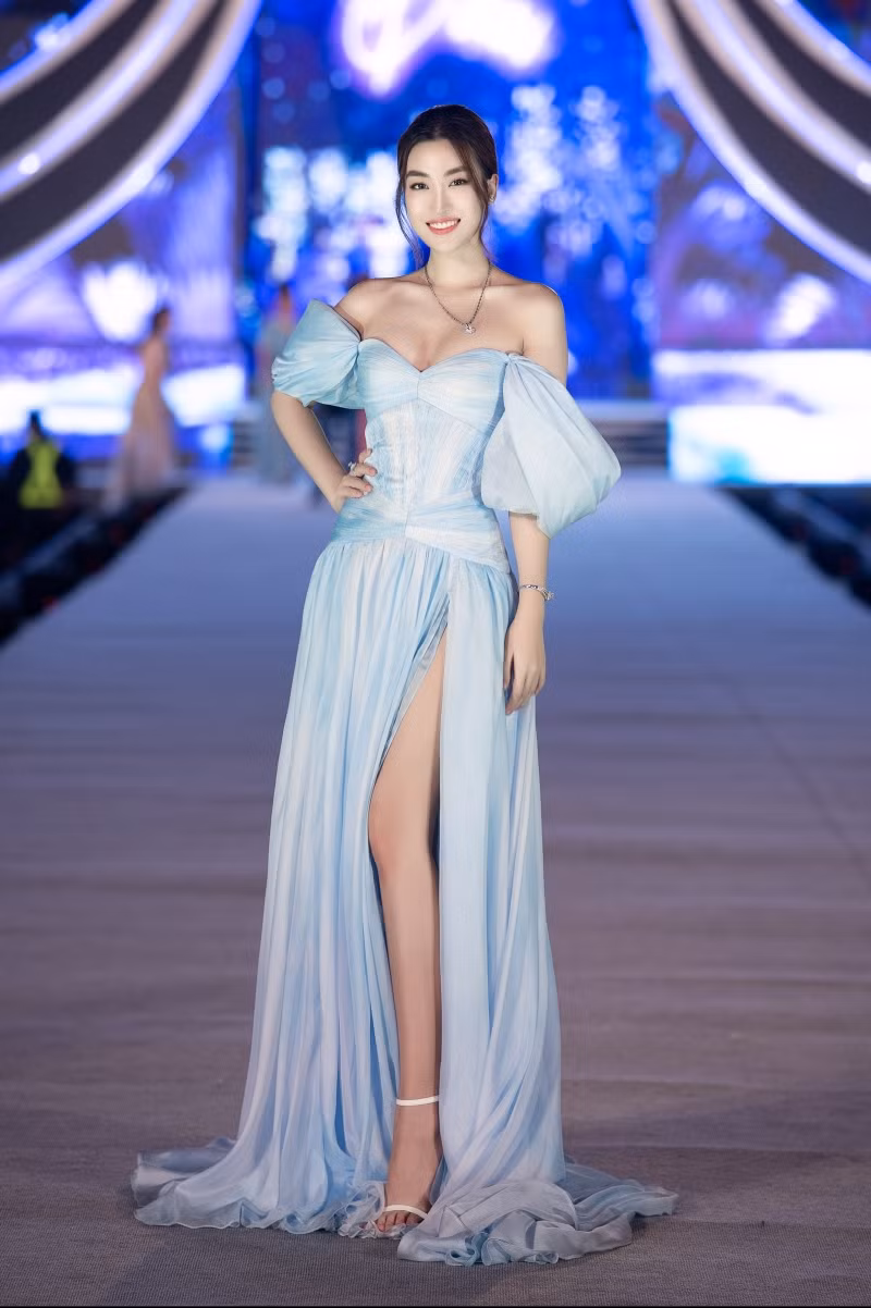 Hoa hậu Đỗ Mỹ Linh lựa chọn một bộ cánh mềm mại của NTK Võ Thành Can. Với sắc xanh tương đồng với màu của biển cả, nàng hậu toát lên vẻ đẹp tựa nữ thần. Việc tham gia thành phần Ban giám khảo của cuộc thi Hoa Hậu Việt Nam trong 2 năm liên tiếp là minh chứng cho vẻ đẹp tri thức và tài năng của Hoa hậu Đỗ Mỹ Linh.