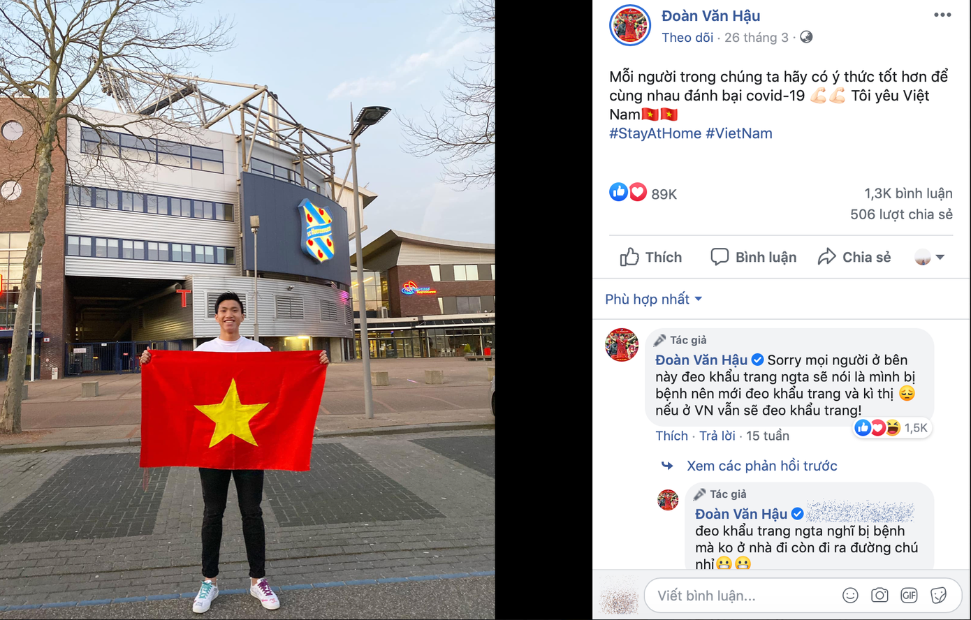 Ở phần bình luận dưới bài đăng, Đoàn Văn Hậu đã giải thích rằng: “Xin lỗi mọi người, ở bên này đeo khẩu trang người ta sẽ nói là mình bị bệnh và kỳ thị. Nếu ở Việt Nam, Hậu vẫn sẽ đeo khẩu trang”.