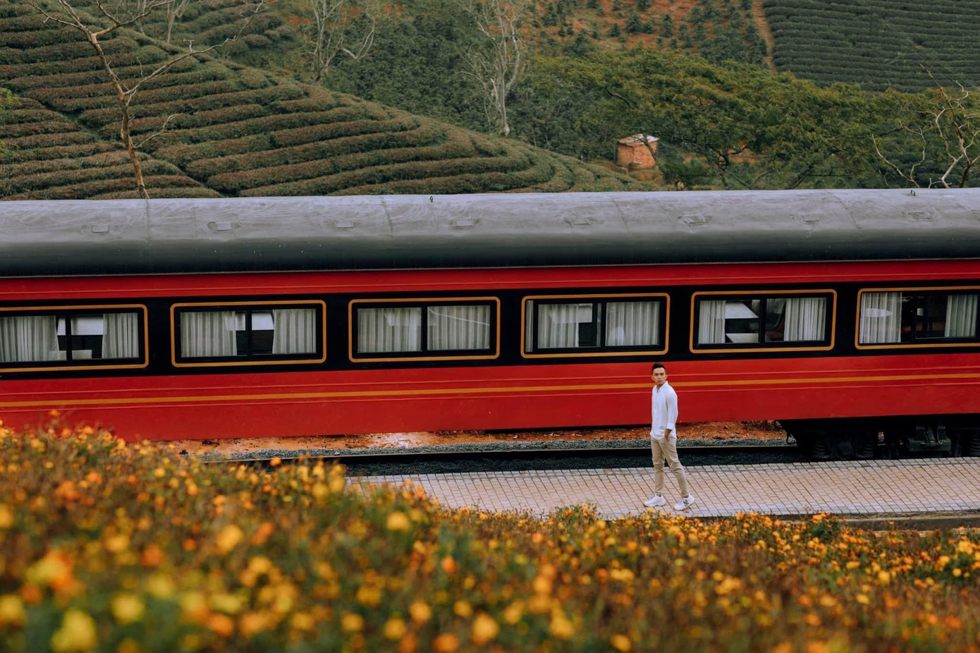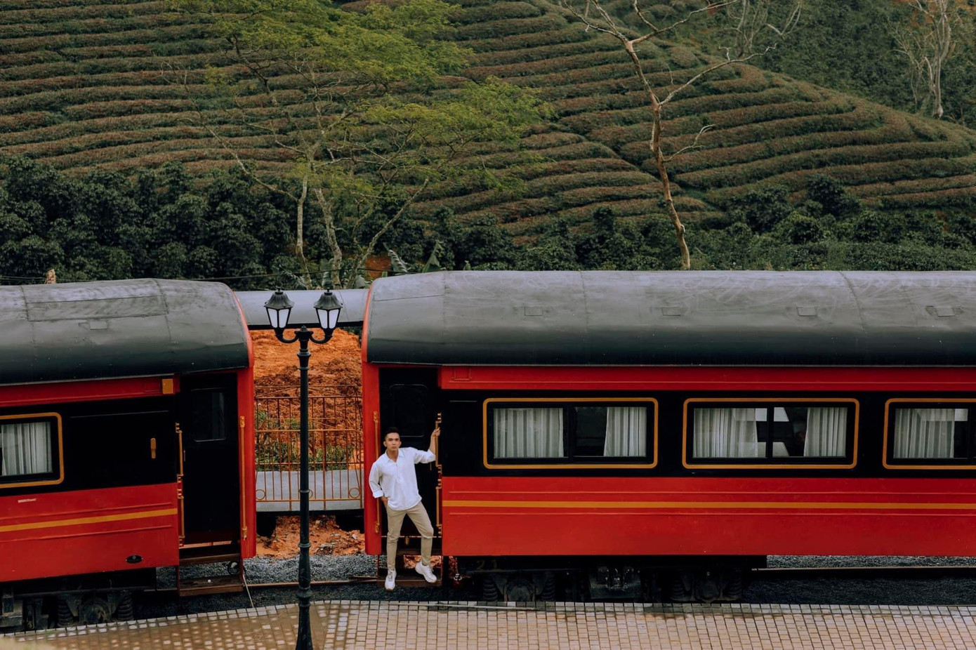 Để có được những bức hình lung linh nhất, bạn có thể chọn chụp từ trên xuống để vừa thấy đoàn tàu, vừa thấy đồi chè xanh mướt cùng mây trời thiên nhiên. Ngoài ra, bên trong đoàn tàu được bài trí bàn ghế xinh xắn để bạn có thể ngồi và nhâm nhi những ly cà phê thơm ngon cũng như phóng tầm mắt ngắm cảnh đồi chè.