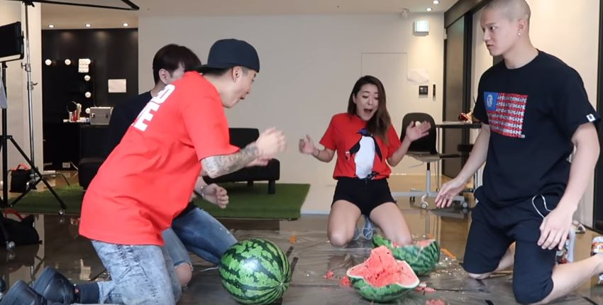 Để chứng minh sức mạnh của mình, Sung Jae quyết định dùng đầu đập vỡ dưa hấu. Tuy nhiên, loại trái cây này cứng hơn so với tưởng tượng nên anh chàng dùng thêm “dụng cụ hỗ trợ” là một chiếc khăn và một tấm thớt lót.