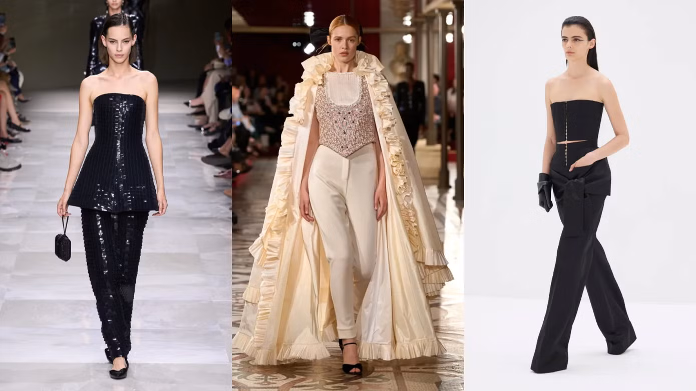 Trên sàn diễn Schiaparelli Couture Fall 2024 xuất hiện chiếc quần âu, lưng cao, rộng từ đùi rồi túm lại ở cổ chân. Trong khi đó, Armani Privé ra mắt phiên bản quần rộng rãi hơn bằng vải satin bóng, màu trắng ngà ngọc trai. Chanel thì phối những chiếc áo khoác dài cùng quần âu ống đứng, cổ điển.