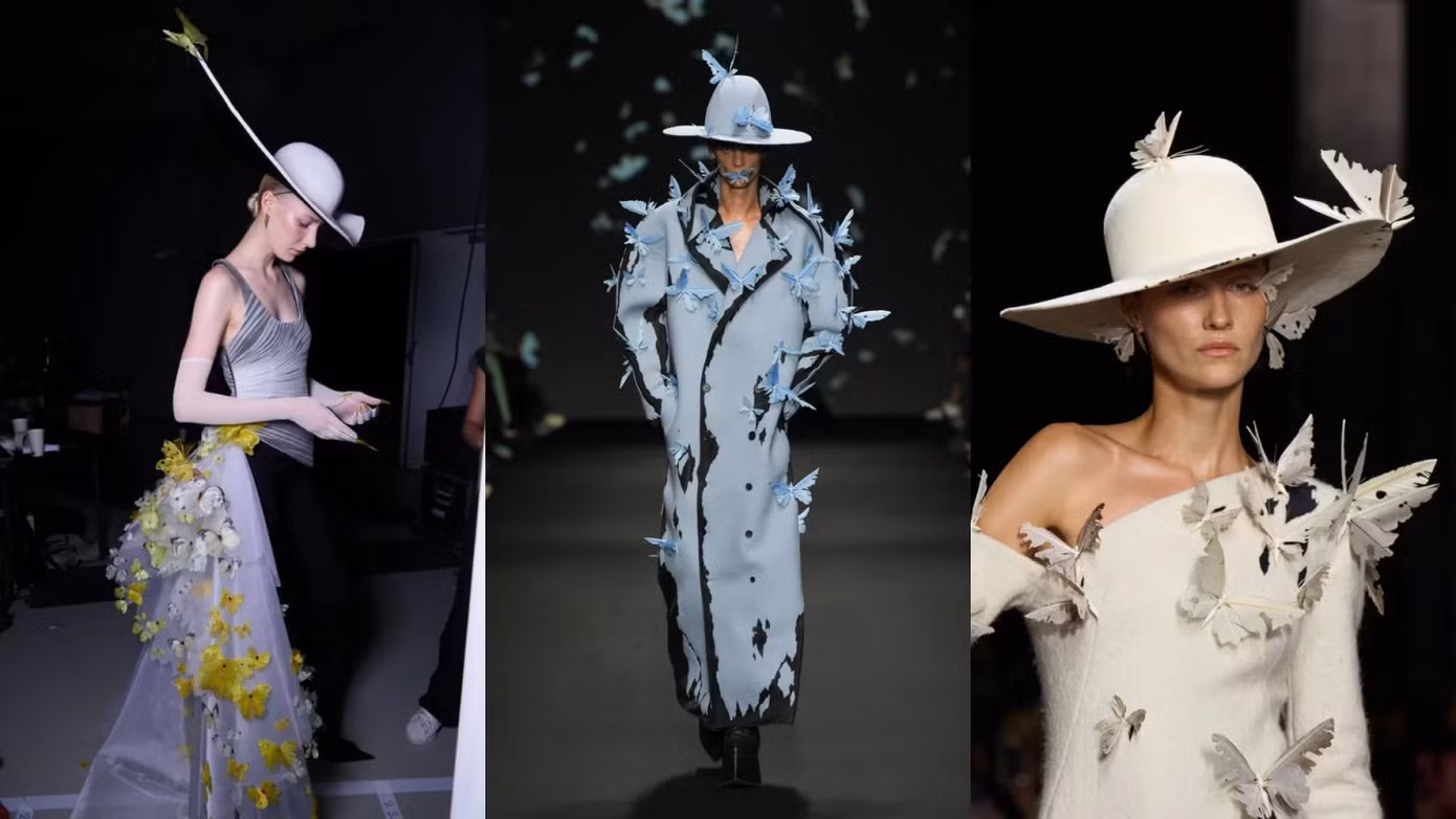 Chi tiết cánh bướm trên những thiết kế độc đáo của Schiaparelli Couture Fall 2024 đầy trừu tượng, lẫn ấn tượng. Balenciaga và Robert Wun tiếp cận rõ ràng hơn, với những đàn bướm tung bay sống động. Cheney Chan và Iris Van Herpen tạo ra những chú bướm khổng lồ từ tà váy và áo choàng lông vũ.