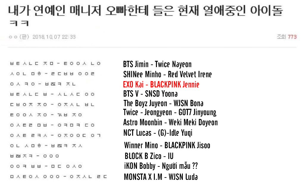 Hồi tháng 10/2018, trên diễn đàn giải trí Pann từng xuất hiện danh sách 11 cặp đôi bí mật của K-Pop. Ngày ấy, mọi người đọc xong rồi nhanh chóng bỏ qua, vì những tin đồn tình cảm kiểu này vốn xuất hiện rất nhiều, và độ chính xác không cao. Nhiều cặp đôi chỉ đọc tên thôi đã thấy chẳng liên quan đến nhau rồi.