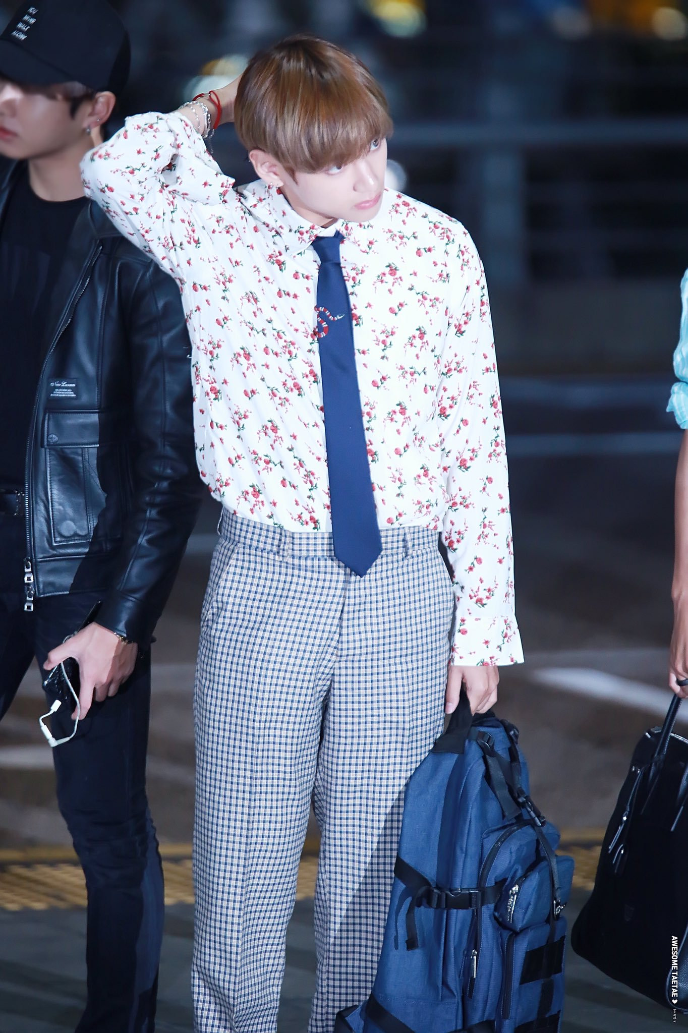 V chắc chắn nổi nhất sân bay ngày hôm ấy nhờ áo sơ mi và túi xách Gucci, với logo hình con rắn quá ấn tượng.
