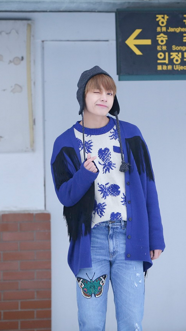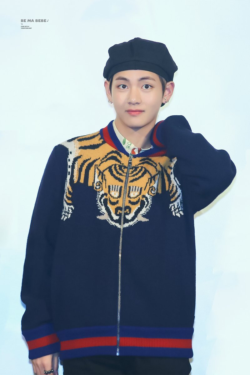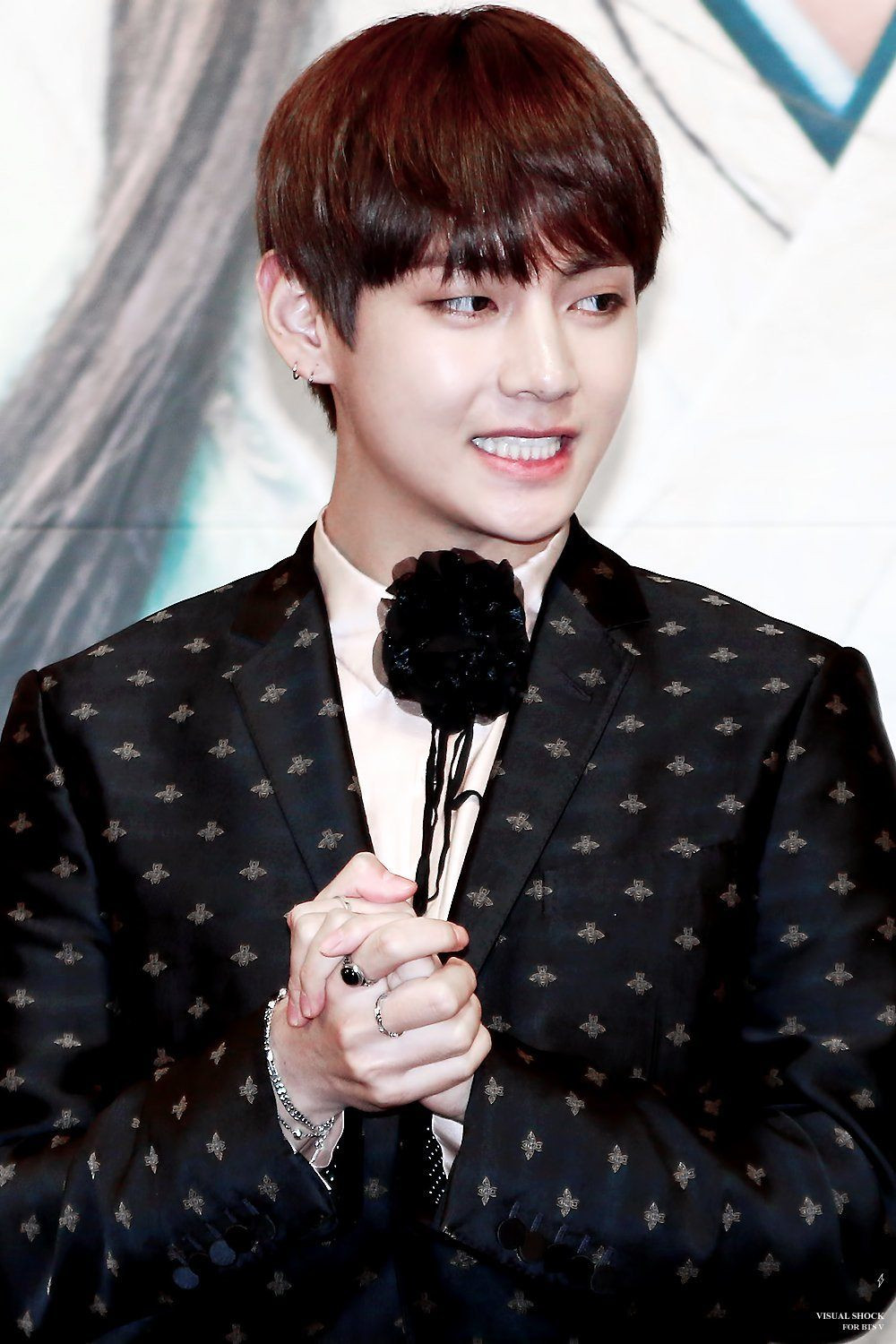 Trong buổi họp báo giới thiệu phim truyền hình Hwarang, V xuất hiện đầy lịch lãm trong bộ suit Gucci màu đen có thêu hoa văn bằng chỉ màu vàng. Anh chàng hoàn thiện cho set đồ của mình bằng một bông hoa vải thay cho cà vạt, và đây cũng là sản phẩm của Gucci nốt.