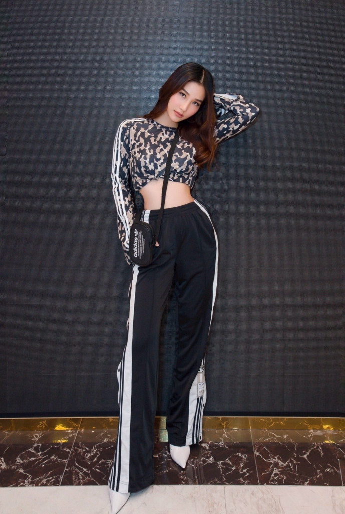 Khác với những bộ váy áo lụa là thường thấy, trong lần xuất hiện này người đẹp khoe dáng trong bộ cánh thể thao khoẻ khoắn. Cô diện chiếc áo croptop hoạ tiết camo nhằm khoe lợi thế vòng hai eo thon gọn, kết hợp là chiếc quần tông đen kẻ sọc trắng nổi bật.