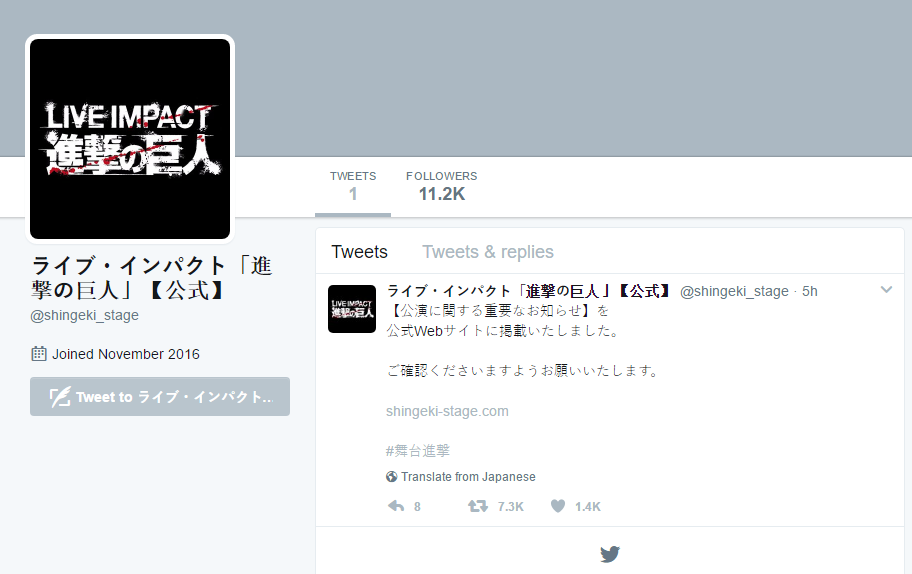 Trước đó, trang Twitter chính thức của vở biểu diễn vẫn luôn cập nhật tin tức cho người hâm mộ, tuy nhiên đã không có một bài đăng nào kể từ xảy ra tai nạn của Yoshino. Tới ngày hôm nay, mọi bài đăng trên trang mạng xã hội này đã bị xóa, chỉ còn duy nhất lại những dòng mang nội dung: "Một thông báo quan trọng đã được đăng trên website chính thức. Mời vào đọc."