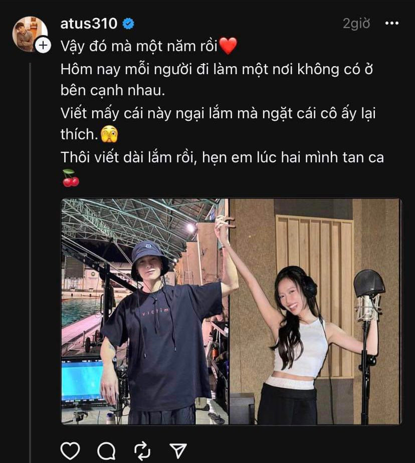 Lý giải cho bức ảnh ghép kỉ niệm ngày trọng đại, Anh Tú bộc bạch trên trang cá nhân: "Hôm nay mỗi đứa đi làm một nơi không có ở cạnh nhau. Hẹn em lúc hai mình tan ca". Mặc dù không ở gần nhau, cặp đôi vẫn tích cực "rải đường" khiến khán giả chỉ có thể ngậm ngùi "người ta yêu nhau nhưng người rung động là tôi".