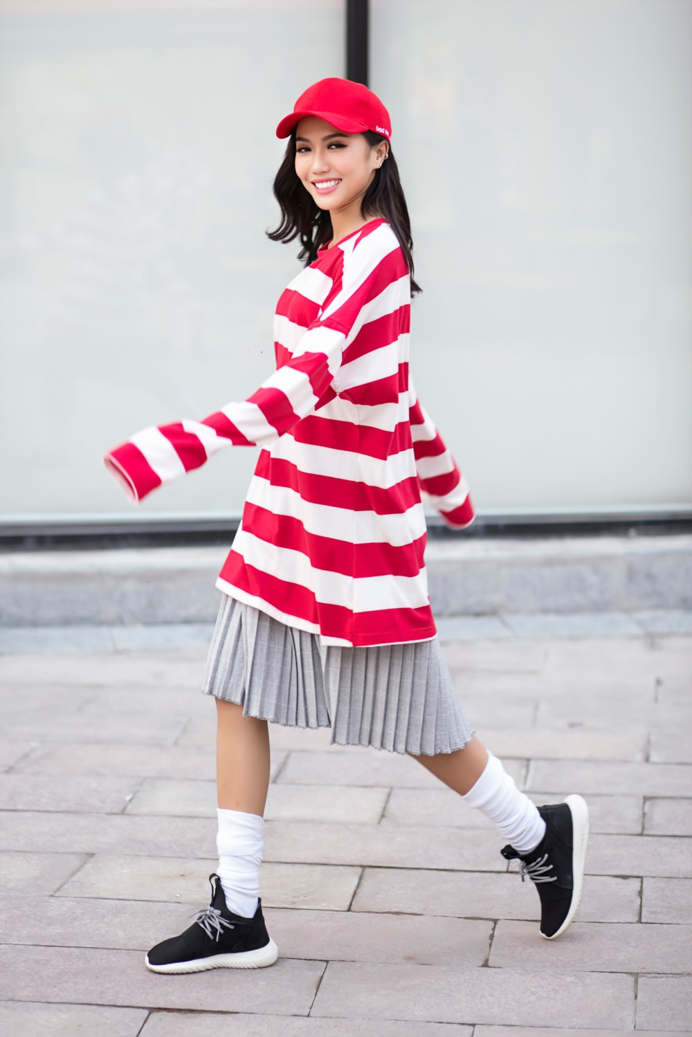 Loạt trang phục oversized trở thành điểm nhấn mạnh mẽ của bộ ảnh. Thay vì những thiết kế ôm sát, Diệu Nhi lựa chọn những thiết kế thiên về độ rộng và chiều dài. Là một tín đồ của kiểu trang phục này, cô không quên chia sẻ bí quyết mặc đồ “vượt size” không luộm thuộm cho các bạn nữ hiện đại. Theo Diệu Nhi, khi mặc trang phục oversized, các bạn nữ phải chú ý đến yếu tố họa tiết. Ưu tiên cho những hoạt tiết to bản, sọc tiết diện to để không tạo sự rối mắt cho người đối diện. Bên cạnh đó, cô cũng cân đối màu sắc giữa mảng áo và quần để không bị “nuốt chửng” bởi bộ trang phục quá rực rỡ.