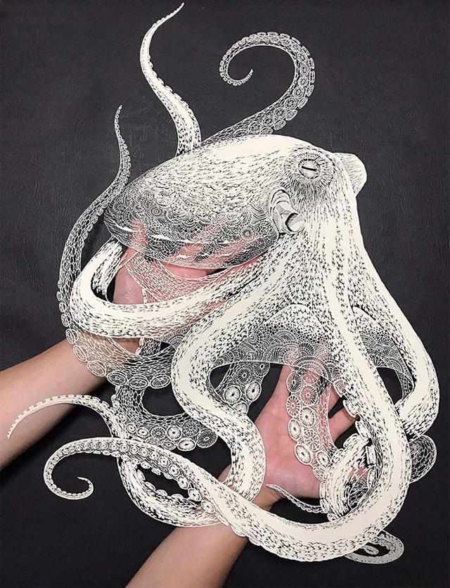 Bạch Tuộc được cắt tỉa tỉ mỉ đến từng chi tiết, từ đôi mắt đến những chiếc xúc tu. Chỉ trên một tờ giấy A2, bằng tài năng và lòng kiên trì, cô Masayo đã cho ra tuyệt tác nghệ thuật như vậy.