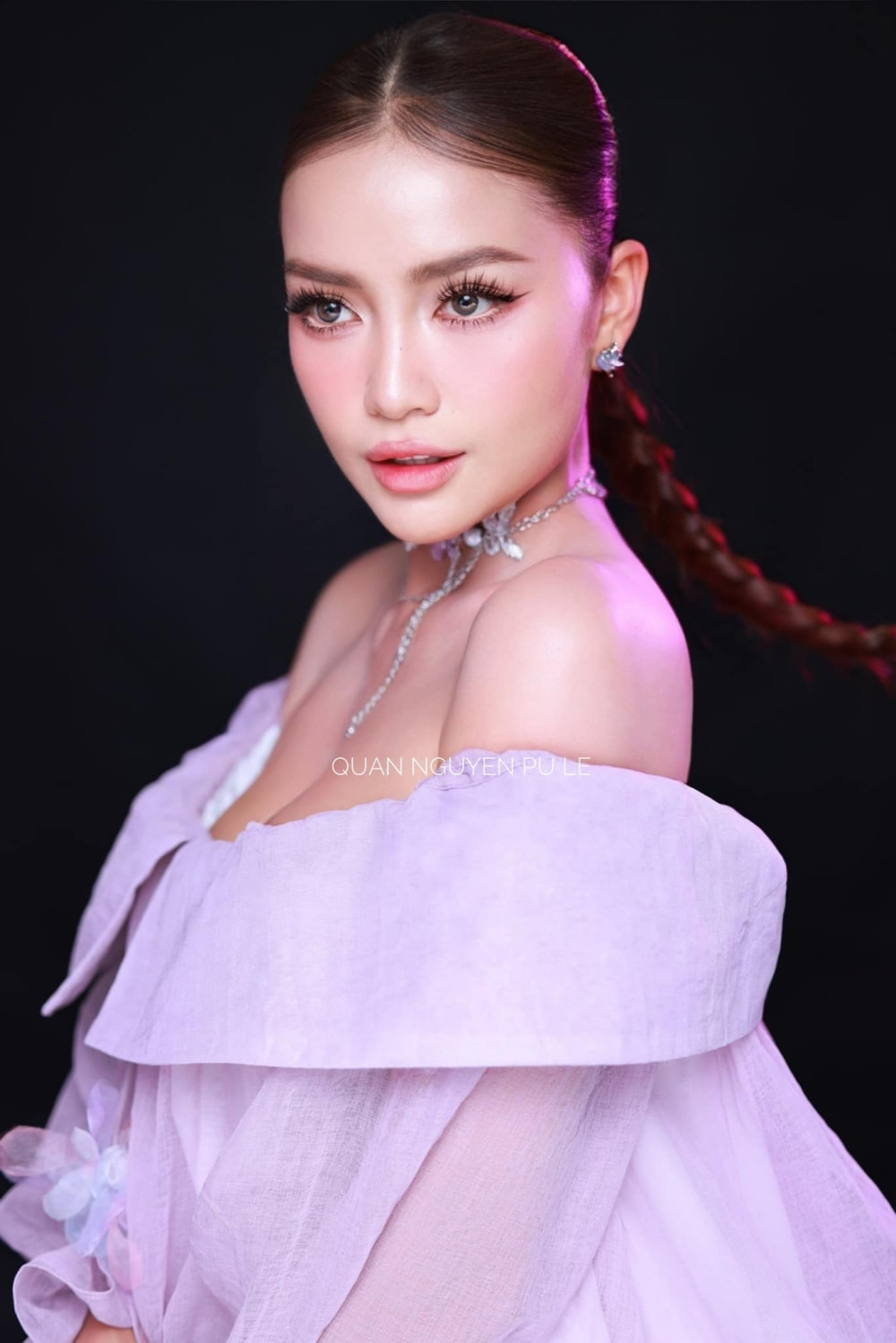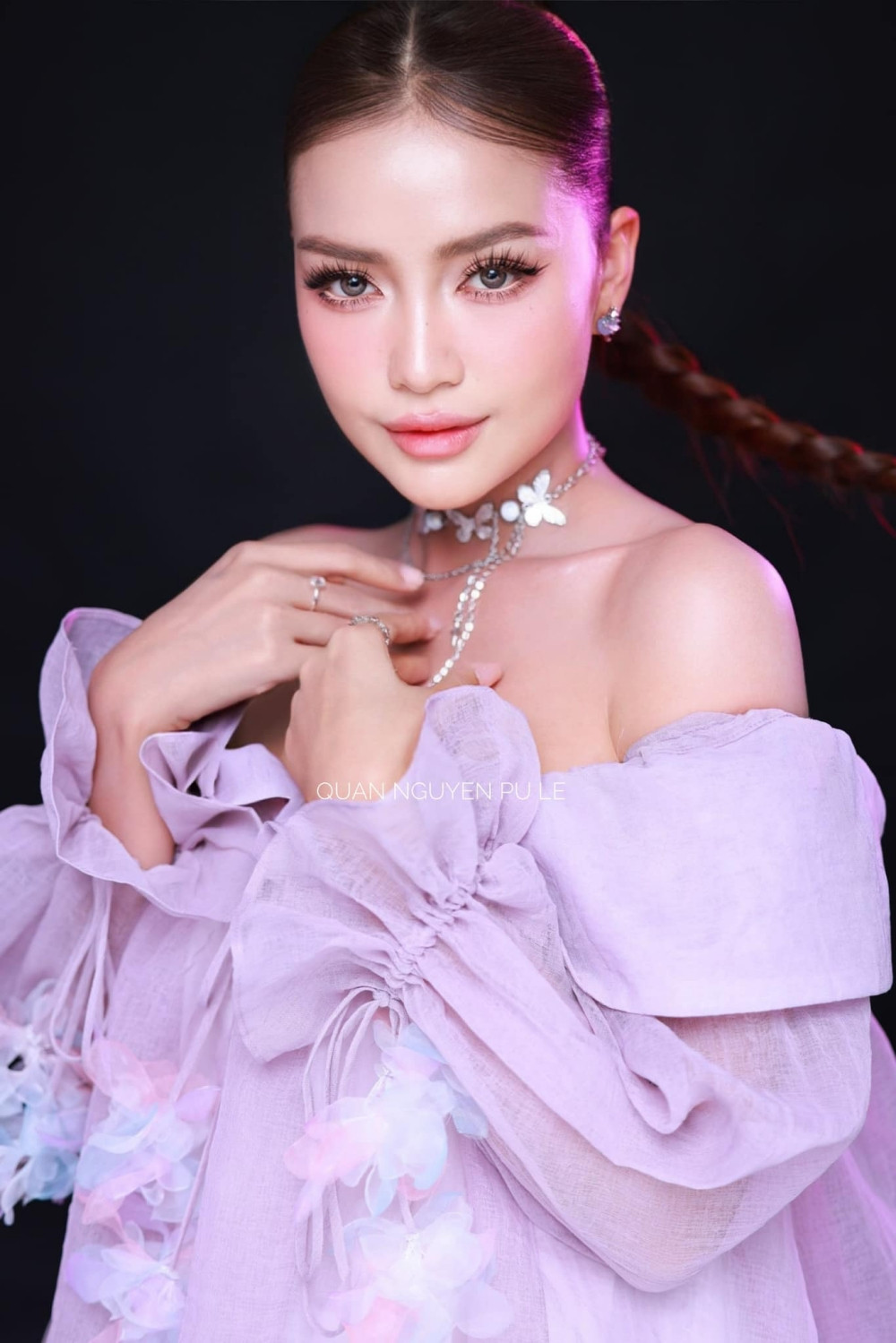 Nàng hậu mặc mẫu váy bồng bềnh màu tím nhạt, có gắn những bông hoa mềm mại. Không ít fan khen Hoa hậu Ngọc Châu trong loạt ảnh này xinh đẹp như một bông hoa bằng lăng tím.