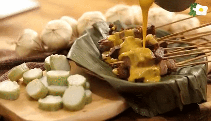 Ăn kèm thịt Satay còn có hành tây cắt miếng vuông và dưa leo. Nhưng bản hòa ca của hương vị không dừng lại ở đó. Nước chấm xốt đậu phộng dùng chung với sa tế là một sáng tạo độc đáo khác, có rất nhiều phá cách khi chu du sang nhiều đất nước Đông Nam Á khác nhau nhưng tựu trưng lại đều vẫn cứ thơm lừng, beo béo và dẻo quẹo rất quyến rũ.