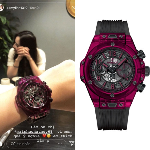 Chiếc đồng hồ dòng Big Bang Unico Red Saphine được thiết kế từ chất liệu saphire và kim cương, cả thế giới chỉ có 200 chiếc. Trước khi được Mai Phương Thúy tặng quà "khủng", Đỗ Mỹ Linh cũng được NTK Lê Thanh Hòa và Hoa hậu Kỳ Duyên tổ chức cho một buổi tiệc riêng.