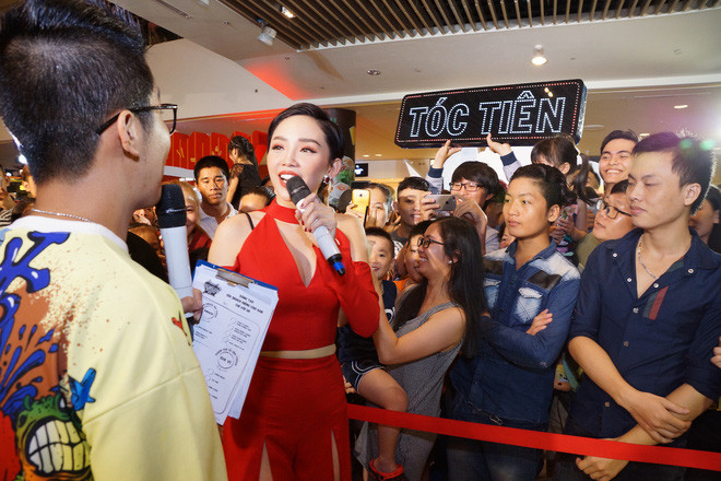 Nữ ca sĩ diện chiếc váy đỏ với những đường cắt táo bạo, khoe chân dài. Tóc Tiên mang đến cho sự kiện một nguồn năng lượng tích cực bởi sự gần gũi của mình.
