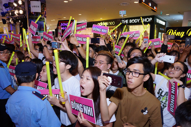 FC của Đông Nhi tạo được sự chú ý khi liên tục hô to tên nữ ca sĩ ngay khi MC Hoàng Rapper vừa thông báo về sự xuất hiện của cô nàng. Đông Nhi xuất hiện với trang phục lấp lánh.