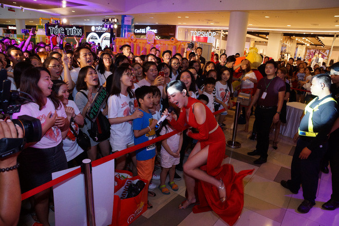Không chi nhiệt tình giao lưu với khán giả, Tóc Tiên còn biến sân khấu của sự kiện thành một mini-show cực chất. Rất đông khán giả đã hòa giọng theo nữ ca sĩ với ca khúc hit "Em không là duy nhất.