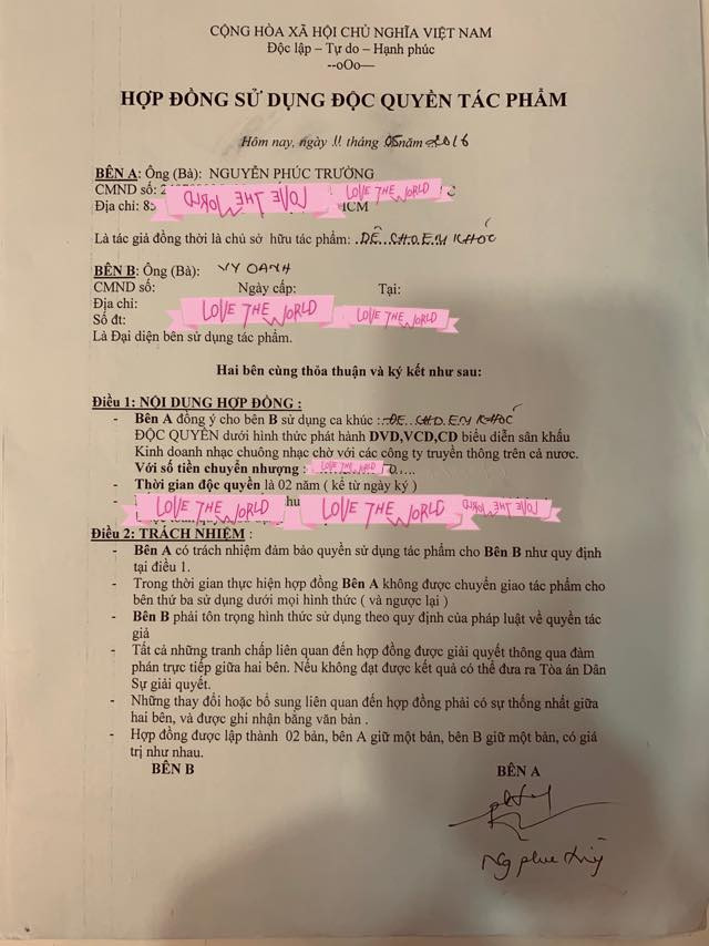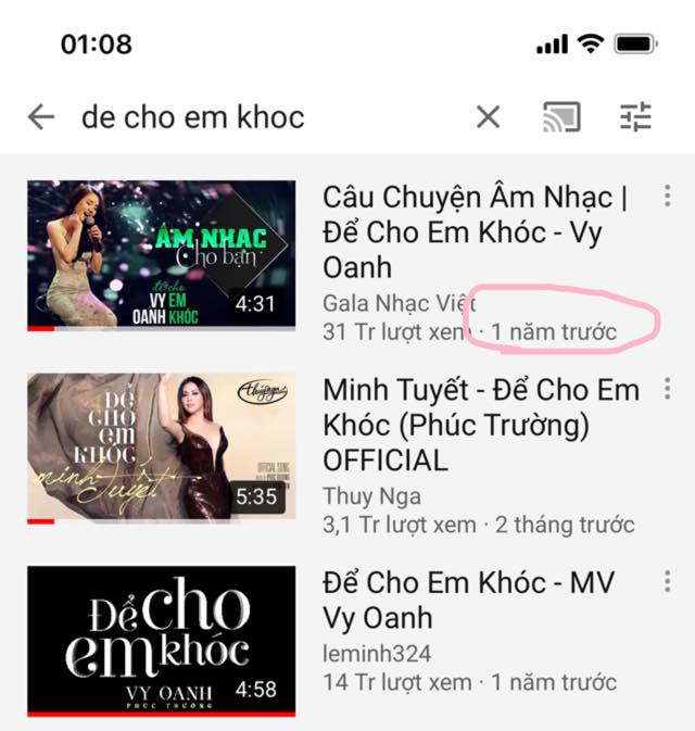 Tiếp đó, hôm 24/1, Vy Oanh tiếp tục đăng tải bằng chứng cho thấy đàn chị Minh Tuyết đã cover ca khúc “Để cho em khóc” từ tháng 3/2018 trong khi đến tháng 6/2018 cô mới hết hạn độc quyền sử dụng ca khúc này.