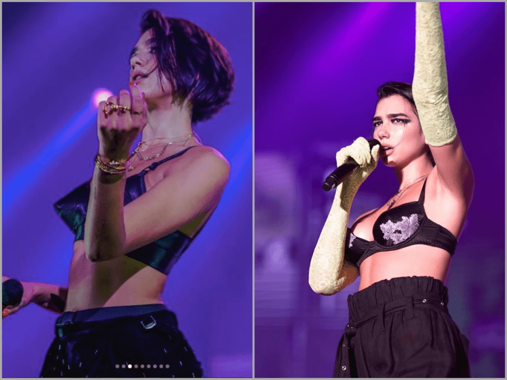 Sự khác biệt về trang phục diễn của Dua Lipa ở các nước Châu Âu và đêm diễn mới đây tại Thượng Hải. Cô nàng được cho là phải đeo găng để che hình xăm.