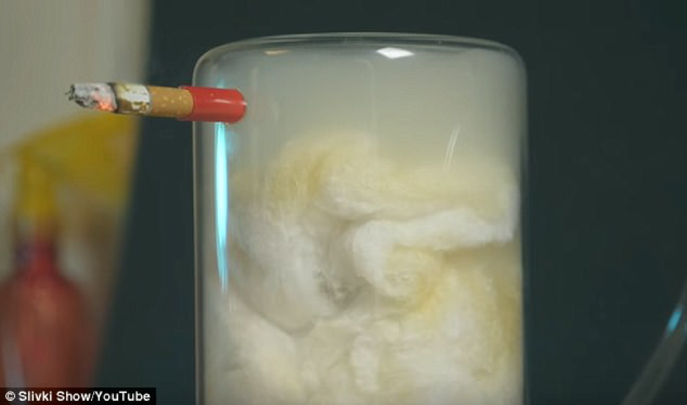 Một video ghi lại đoạn thí nghiệm với bông trong một chiếc xy-lanh thủy tinh được gắn với máy nén, đã mô phỏng phổi của người hút 300 điếu thuốc lá sẽ như thế nào.