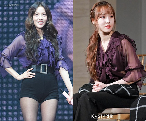 Jisoo (Black Pink) phối sơ mi bèo nhún của Sez-Wich với quần shorts và thắt lưng bản to, tạo thành đồ diễn sexy. Item có giá 800k này cũng được lòng Yuju (GFriend) nhưng cô lại có cách phối đơn giản hơn, kết hợp với quần đen basic tạo vẻ nữ tính và dịu dàng.