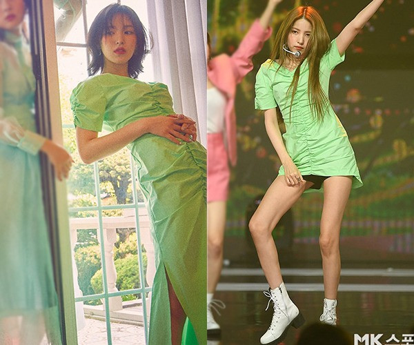 Chiếc váy màu xanh neon của nhãn hiệu 21Mar80 được cả Wendy (Red Velvet) và Sowon (GFriend) lựa chọn. Wendy (trái) đẹp dịu dàng và mơ màng trong bức ảnh họa báo cho tạp chí Allure Korea. Trong khi đó Sowon tăng độ phá cách khi cắt item thành váy ngắn, phối cùng boots trắng cá tính.